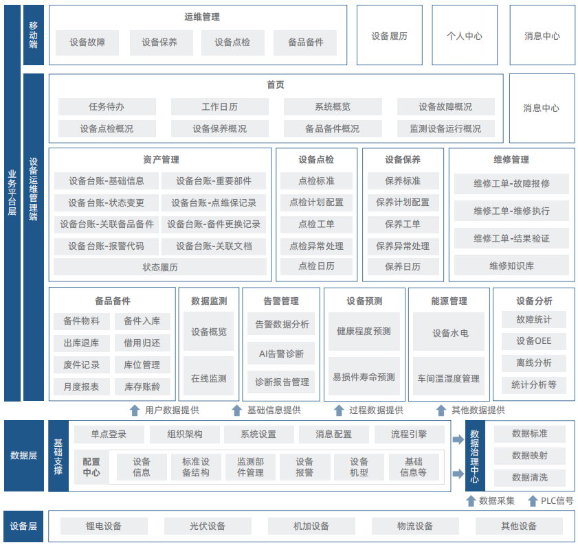 设备全生命周期管理和预测性维护。通过对设备资产、设备点维保、备件管理等的闭环管理,强化企业现有运维工具的数据和流程管控能力;基